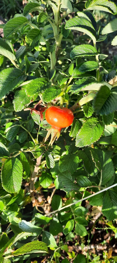 Wood’s Rose ~ the most beautiful sight in my early fall garden. This is the wild native rose from the Mississippi to the Pacific, from Mexico into Alaska. The hips are the best source of vitamin C in native fruit. They will turn deep red when ripe. I’m going to eat this one right off the bush and save the seeds. I treat the seeds just as nature does: a wild turkey or other upland bird will eat the hip. The seeds go through the digestion process but their rock-hard shells save them. The acid bath and the grinding of the food inside the bird scar the shell. The seeds pass through and lie on the ground through freezing winter days. The freezing develops tiny cracks in the seed shell. The flood of melting snow and spring rain swell the seed. Some seeds will sprout… very few. I will give these seeds their acid bath, then a gentle grind with a mortar and pestle, a second acid bath, and grind, and leave them to the coming cold. Only one of 8 seeds sprouted this year.