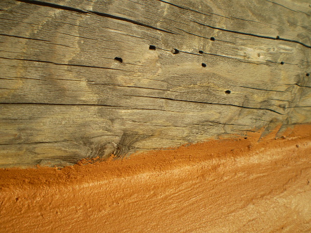 Observation: It dawned on me that these tiny holes with their green and brown seals were very small, possibly too small for the grasshoppers to get their jaws in to pull out the seals. Certainly they were smaller than the bamboo bee house, and not at all soft like the foam from the front door header.