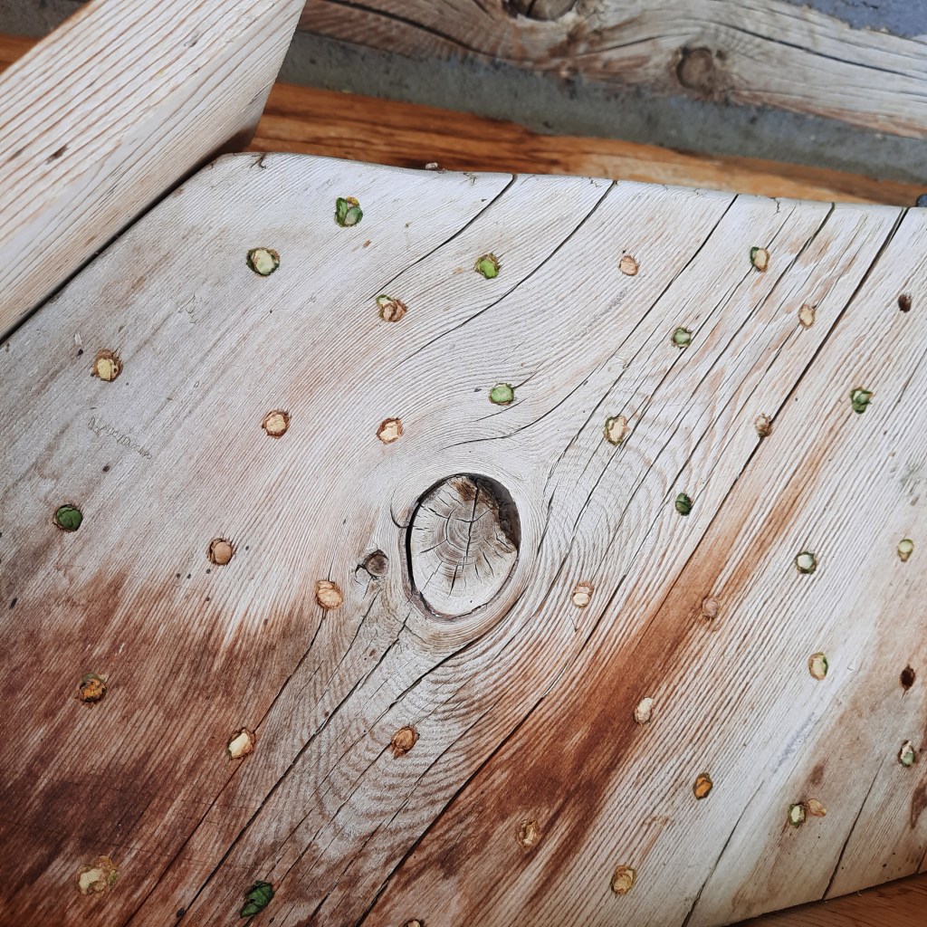 So to increase a population, one increases the habitat. And with that I did an experiment with a chunk of left-over, untreated lumber by matching a drill to the size of the favored nest hole. I added a little overhang roof to help protect it from rain, and I mounted it on the east side of the cabin. Lo and behold, in fall this is what I found: