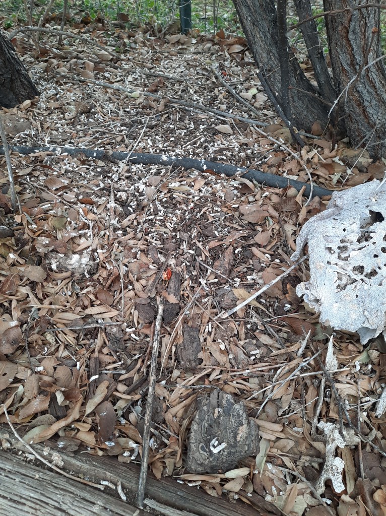 When the air was calm the birds resting in these shrubs relieved themselves directly to the ground below. The ground under the young shrubs is as white as if snow had fallen all day. The breezes and gale warnings blow the bits of partially-eaten insects, string, hair from cow tails, feathers and leaves from Spring nests down to the ground adding organic matter and material to decay in the ground below, mixed with the droppings of their food and guano from their warm little bodies.